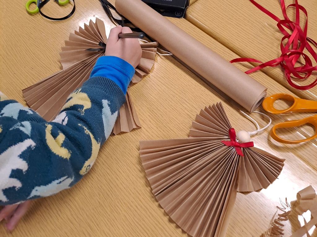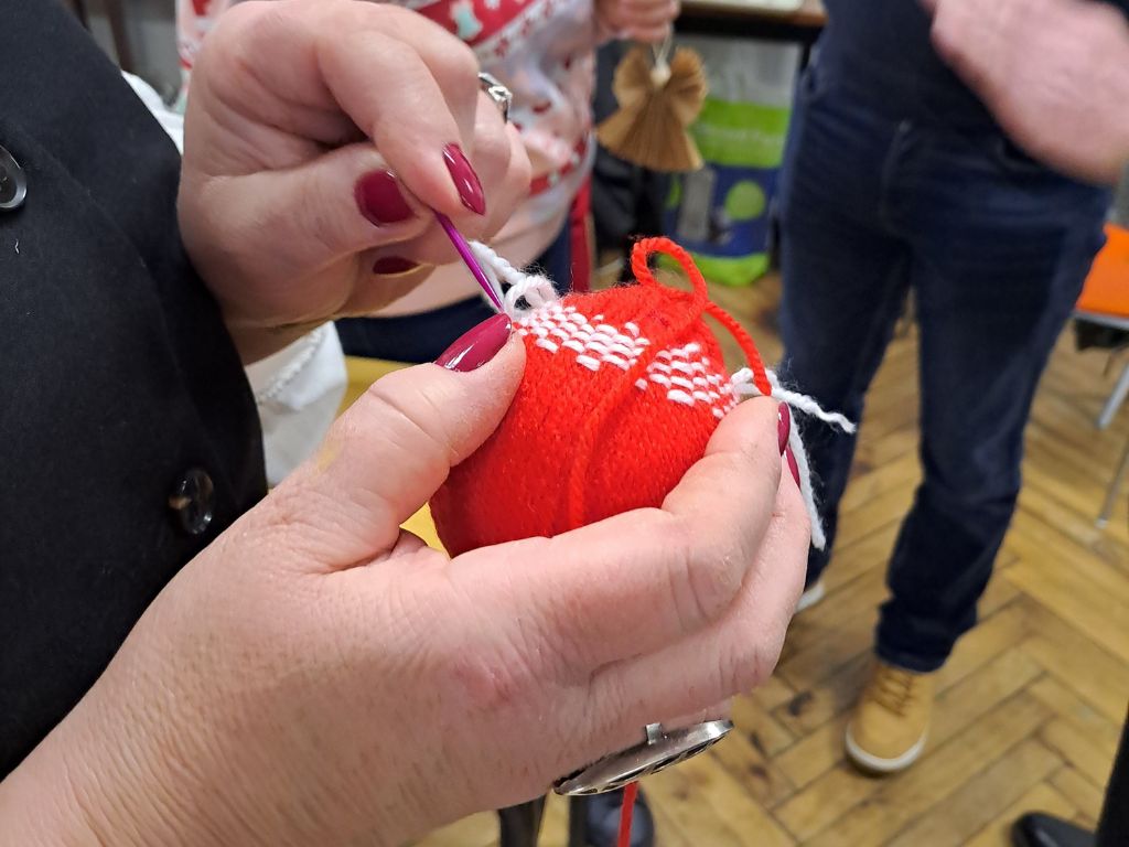 Après cette introduction historique, les participants se sont lancés dans des ateliers artisanaux. Répartis en groupes, ils ont fabriqué des décorations de Noël avec des matériaux variés – paille, papier, laine et tissus. Chaque atelier était animé par des membres de l’association : Claire Aubert, tisseuse amie de l’association, a montré comment décorer des boules en polystyrène avec de la laine ; Małgorzata Ciesielska a enseigné la fabrication de petits anges en papier ; et Sylwia Rusak a présenté les techniques pour réaliser des étoiles en paille. Les participants ont travaillé avec un réel enthousiasme, certains prévoyant de poursuivre leurs créations à la maison. Une partie des matériaux, comme la paille, a été distribuée pour permettre de continuer les activités artisanales chez soi.