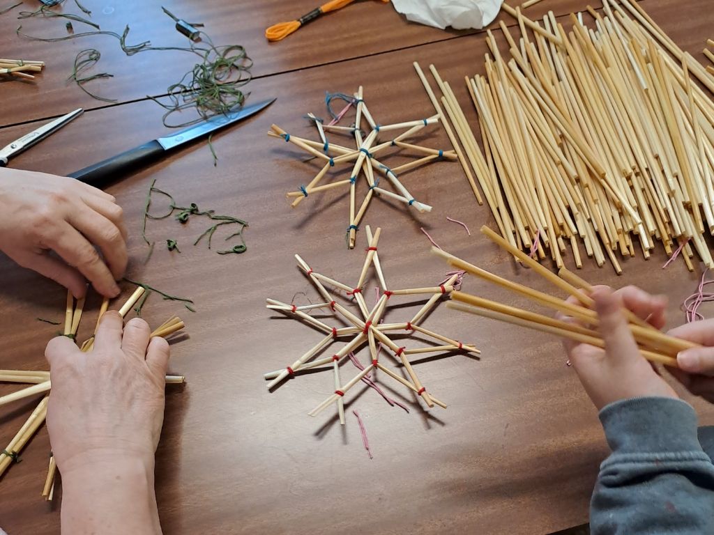 Po wprowadzeniu historycznym przyszedł czas na warsztaty rękodzielnicze. Uczestnicy, podzieleni na grupy, tworzyli świąteczne ozdoby z różnorodnych materiałów – słomy, papieru, włóczki i tkanin. Każde atelier prowadzone było przez członków stowarzyszenia: Claire Aubert, zaprzyjaźniona tkaczka, pokazała, jak ozdobić styropianowe bombki włóczką; Małgorzata Ciesielska nauczała tworzenia papierowych aniołków; a Sylwia Rusak prezentowała tajniki robienia słomianych gwiazdek. Uczestnicy z prawdziwym zapałem wykonywali ozdoby, a niektórzy planowali kontynuować rękodzieło w domu. Część materiałów, jak słoma, została rozdana, aby umożliwić dalszą twórczość w domowym zaciszu.
