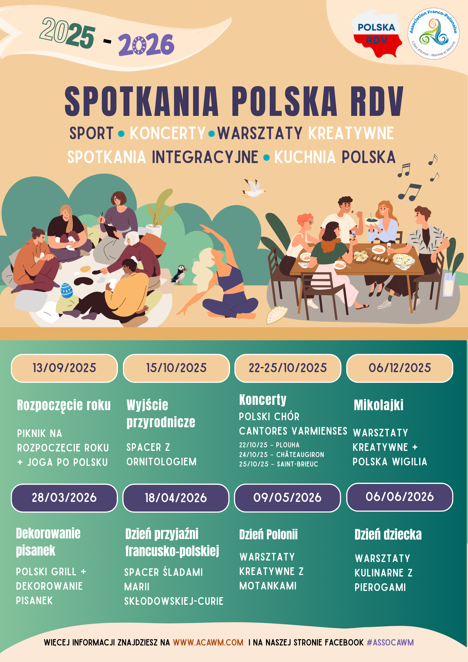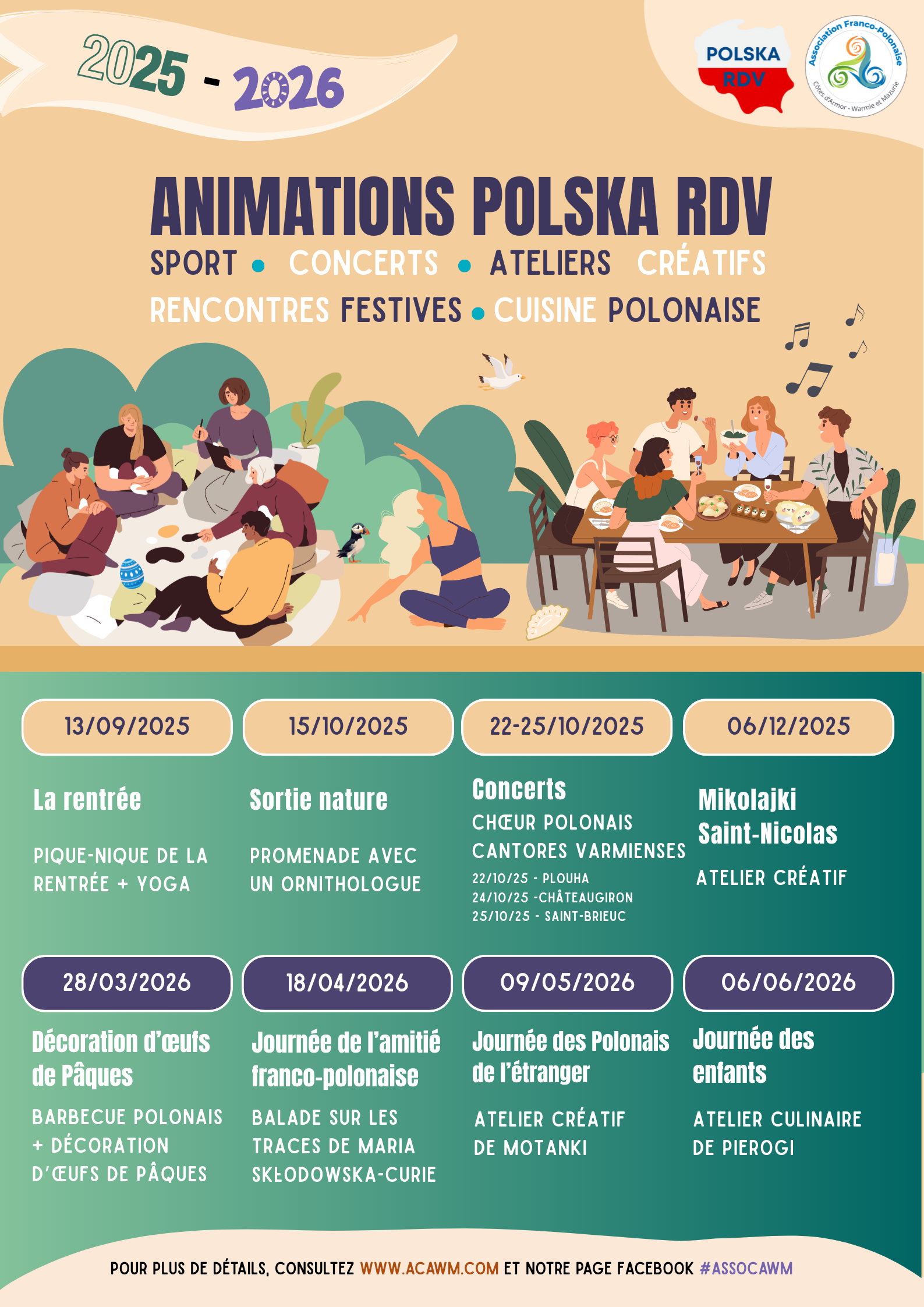 À la rentrée, nous avons préparé un large programme d’événements et de rencontres pour l’année scolaire 2025-2026. Les Polska RDV sont une belle occasion de cultiver votre « Polonitude » dans notre région et de partager des moments qui deviendront rapidement une tradition à Saint-Brieuc.